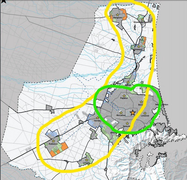 In the future over half the expected population growth for Greater Christchurch will be housed between 10 and 25 km from the city centre in greenfield areas (see above map -areas marked in green or orange) to the north and southwest of Christchurch. This means the city will develop a more ‘fat banana’ shape. The city can adapt to this evolution in several different ways.