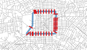 - More disruptive to city centre. Crosses Deans Ave and Moorhouse Ave. Will take road space from Madras street (a significant part of the one-way system) and Riccarton Ave (although a future light rail spoke to Canterbury University and Airport could also use the Riccarton Ave line).