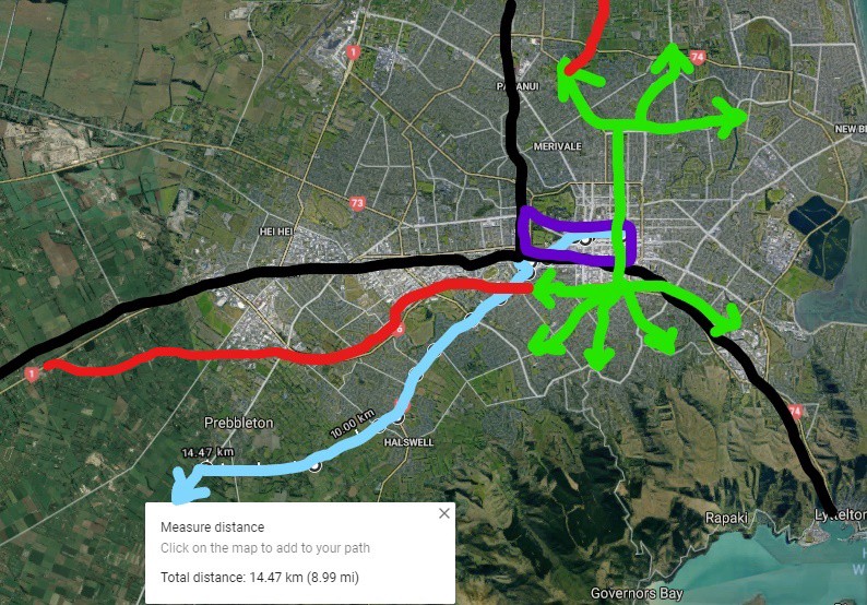 - The spine supports more dispersed growth than the other two proposals. Being able to service multiple small suburbs to the north and south with fast bus services. This has advantages for increasing competition with respect to land supply. But the dispersal factor also means the spine would be less effective at master planning new transport infrastructure with integrated land use. Because of this it only provides a partial solution for developing the southern part of the Greater Christchurch ‘fat banana’.