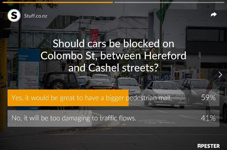Michael Hayward of The Press interviewed me within half of day of the above blog being published. His article was good and balanced, and created a healthy amount of discussion. The Press ran a poll as part of their online version and 59% of readers ultimately supported the proposal to close Colombo Street.