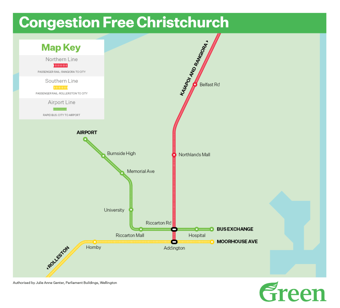 Green lines are the existing heavy rail tracks. Blue lines could be new tram tracks that create an inner city loop and new lines from Riccarton to the University + Airport to the north west and a line out to new housing areas in Halswell to the south west.