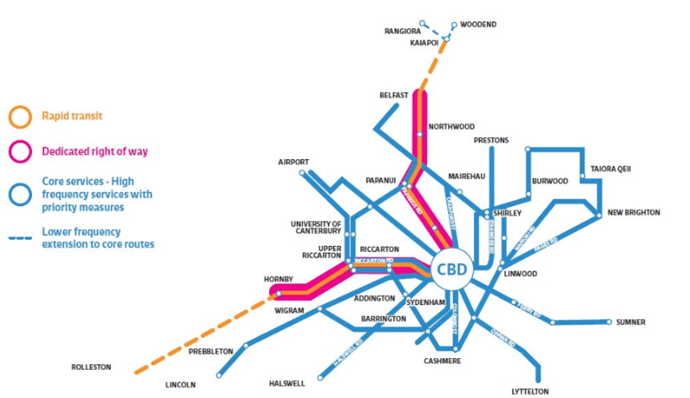 The on the road distance from Belfast to Hornby via the CBD is about 20km so to upgrade this route to rapid transit will likely cost $1.2 to $2bn. This is not an impossibly large figure -Auckland and Wellington are getting bigger rapid transport packages -but is it the best bang for the buck?