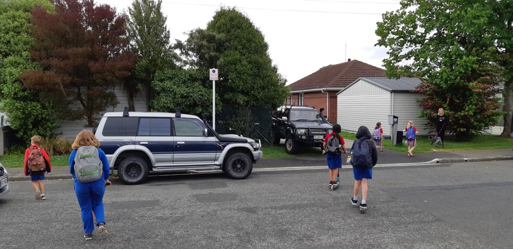 On the topic of unsafe crossings, people parking cars over them don’t help. The snap below is taken outside my daughter’s school gate where all the kids cross the road. That sign behind the SUV says “No Parking” at school pick-up drop-off times. Almost everyday someone illegally parks there. It makes it very dangerous for the kids trying to cross as they can’t see anything till they step out on the road. I got the bonus in this picture with the guy who’s parked his SUV half on the footpath so everyone has to walk around it. Chrsitchurch desperately needs more parking enforcement. Or maybe we just need to re-prioritse the existing enforcement away from people overstaying their ticket in town, and concentrate more on towing away the vehicles that are genuinely putting people’s lives at risk, of which there are plenty around the city on any given day.