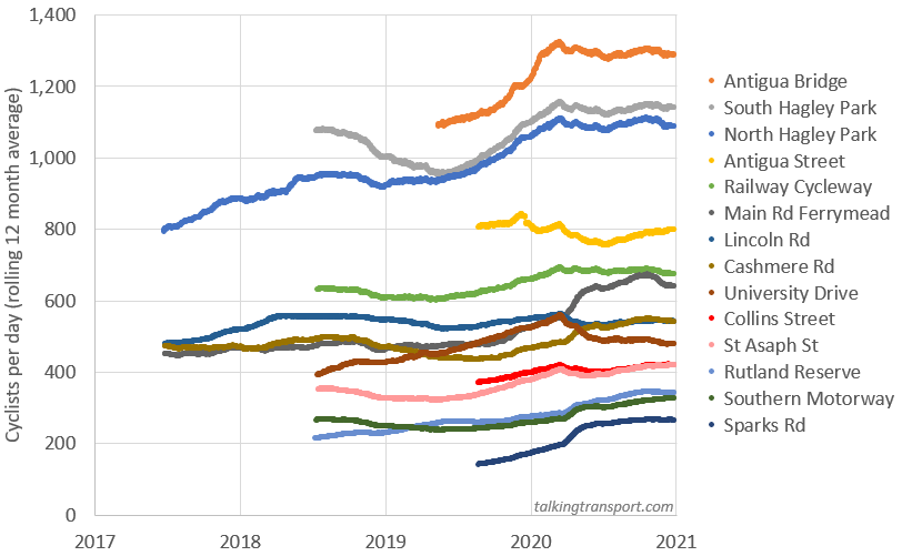 I’ve graphed the data from the 14 busiest sites below. I’ve fixed up some gaps in the data and used a rolling 12-month average to take out the seasonality aspect. So each point in the graph below shows the average number of cyclists each day in the preceding 12 month period. Two of the sites (Antigua Street and Lincoln Road) only have sensors in one direction, so I’ve doubled their numbers to estimate the two-way cycle number.