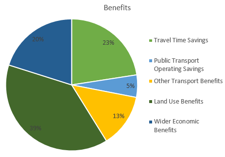 39% of benefits were land use benefits. This is typical of mass rapid transit projects, where land along the corridor suddenly becomes more useful and therefore more valuable. People find it useful living near light rail lines, and businesses find it useful to locate there.
