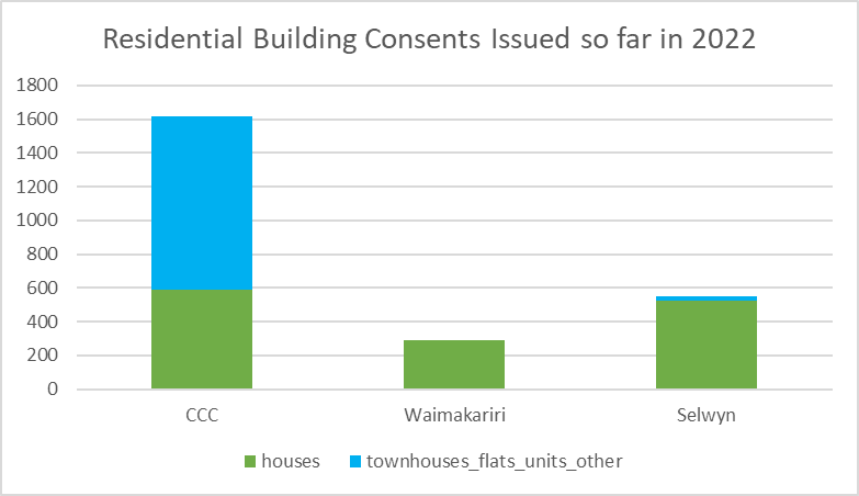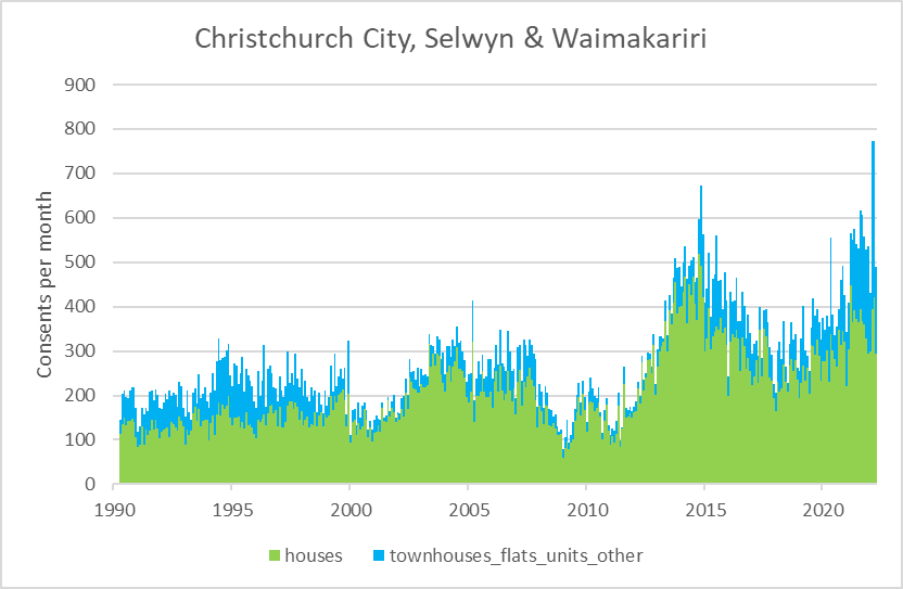 Christchurch has had the bulk of the new housing, Selwyn next, then Waimakariri. Housing type is very different across these. Waimakariri is literally 100% standalone houses, Selwyn is close but does have a handful of other homes. Only Christchurch City has any meaningful number of other home types, with multi-unit dwellings making up a comfortable majority.