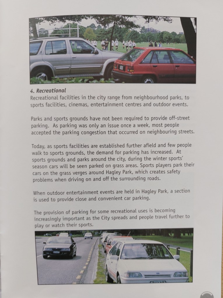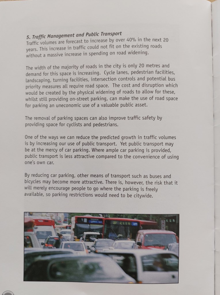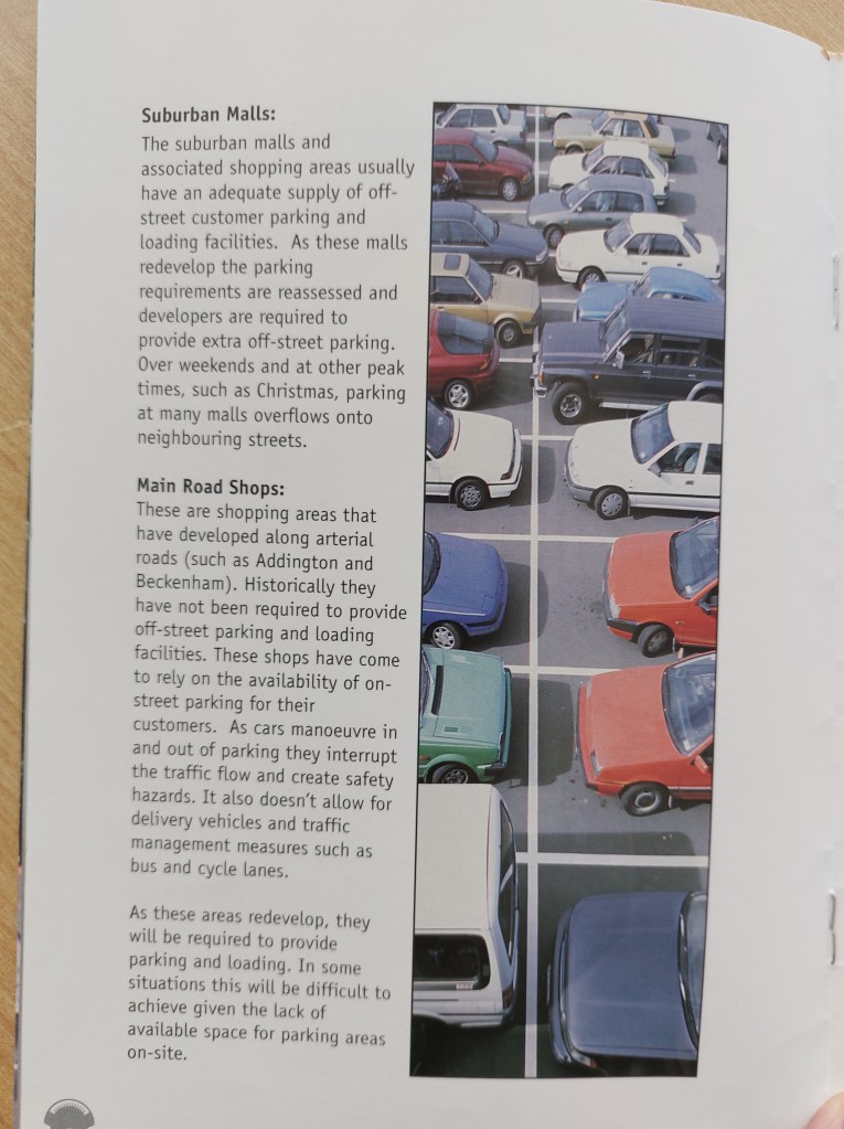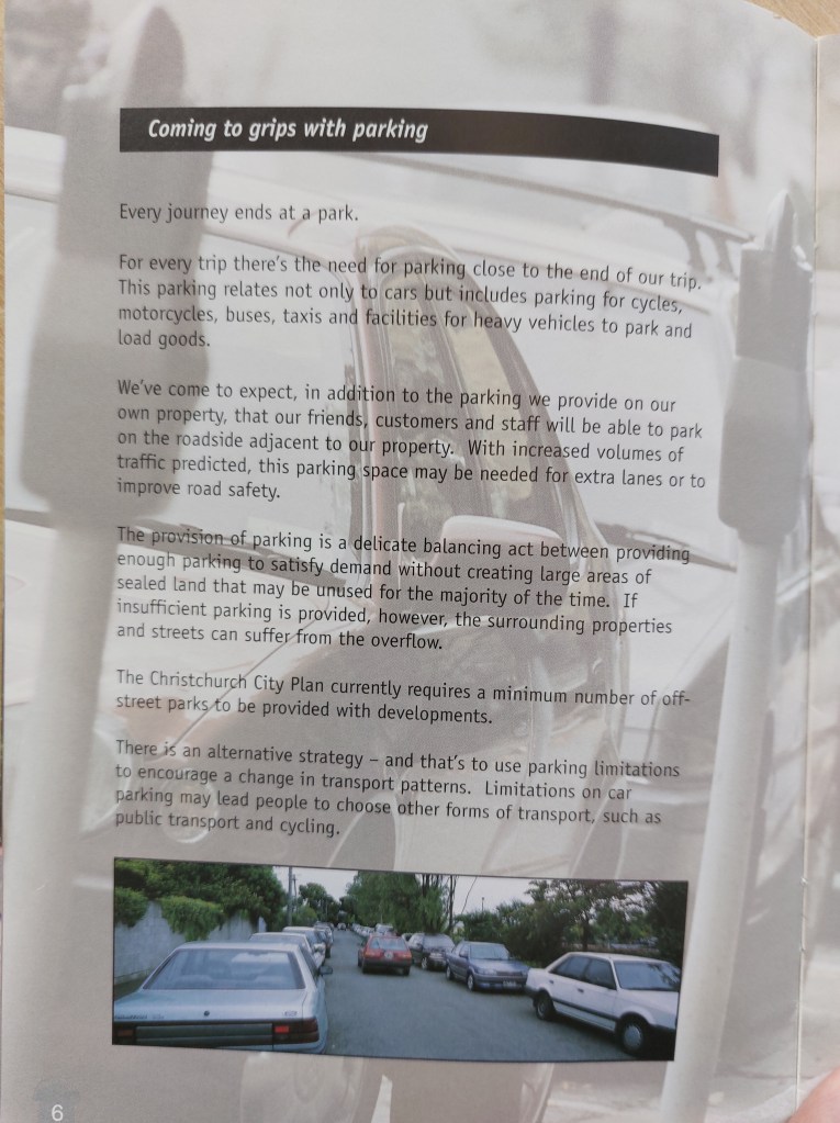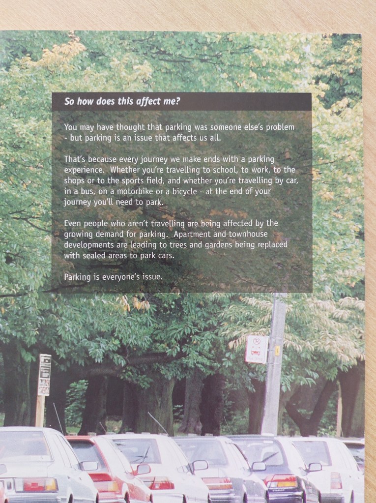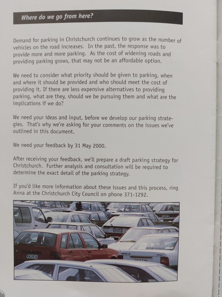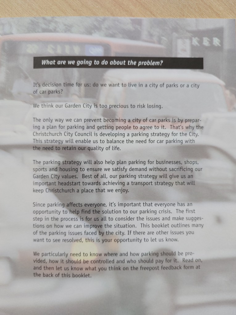 It turned out to be a consultation document for the 2003 Christchurch parking strategy. I thought it was quite an interesting way to do it. Consultation documents can often be stuffy, dry reads, But this one is packed full of puns, outrageous strawmen, and very emotive language.