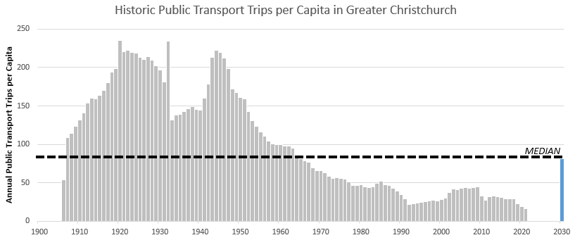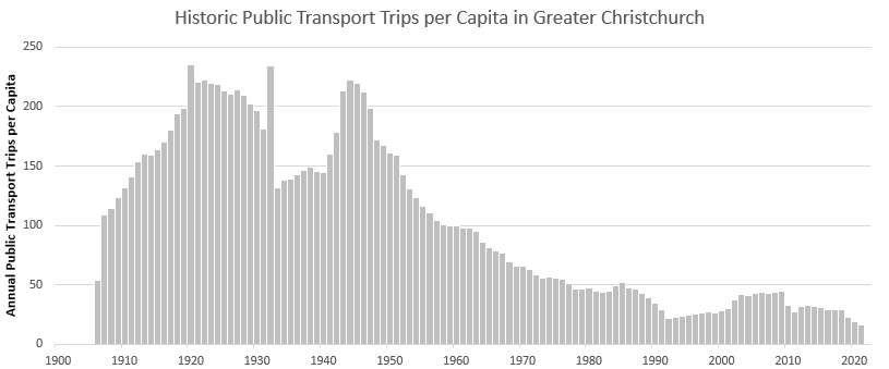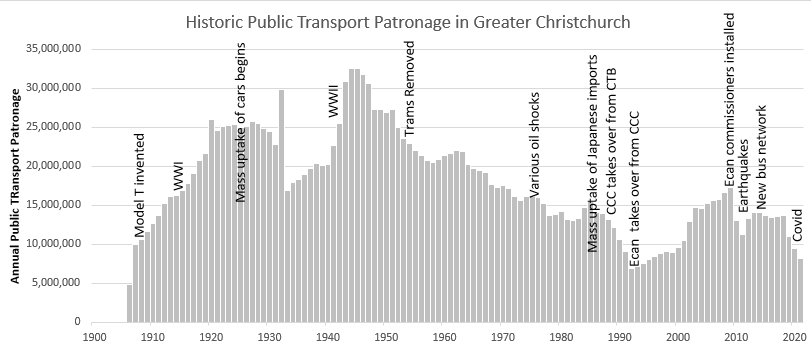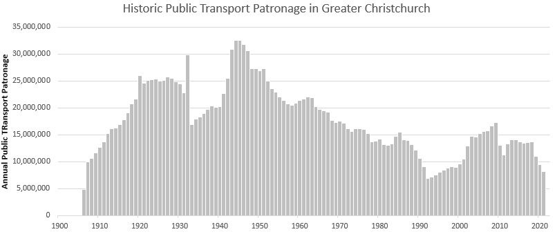 I think this is quite a useful visual. Similarly to Auckland, it shows that the upcoming level of public transport use is unprecedented in living memory, yet is still below the level that Christchurch has operated at for most of its history.