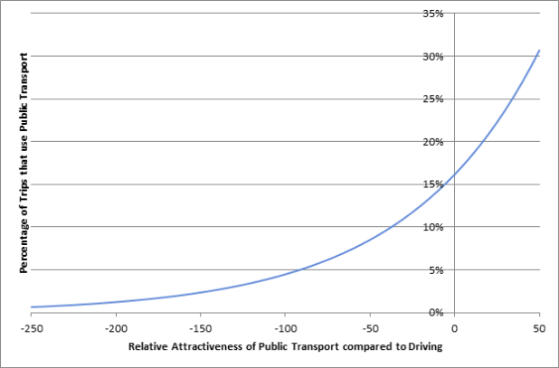 The graph below shows an equation transport planners use when trying to predict people’s choice of travel mode. It has been derived from observations of real-life behaviour in Christchurch. The horizontal axis shows the relative attractiveness of taking a trip on public transport compared to driving. For most trips the relative attractiveness is negative, meaning that driving is more attractive than catching the bus. “Attractiveness” is a number that’s calculated from a range of factors, but the most important one is the door-to-door travel time. For the rest of this blog just think “travel time” whenever I say “attractiveness”. The vertical axis shows the proportion of people who will choose to make that trip on public transport.