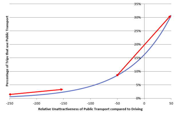 Whereas if you can find a trip where buses are only slightly less attractive than driving, and improve the buses so that they flip over to being more attractive than driving, you’ll find that you get a big increase in the proportion of people choosing to catch it (right-hand red arrow).