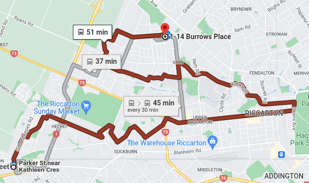 In a city like Christchurch, where it’s relatively easy to drive, most trips take longer if you choose to make them on a bus compared to if you drive. And most people in Christchurch have the option of driving, we have one of the highest rates of car ownership in the world. If the same trip takes 51 minutes on a bus or 11 minutes in a car, the vast majority of people will choose the car. For example, this trip from Hornby to Ilam.