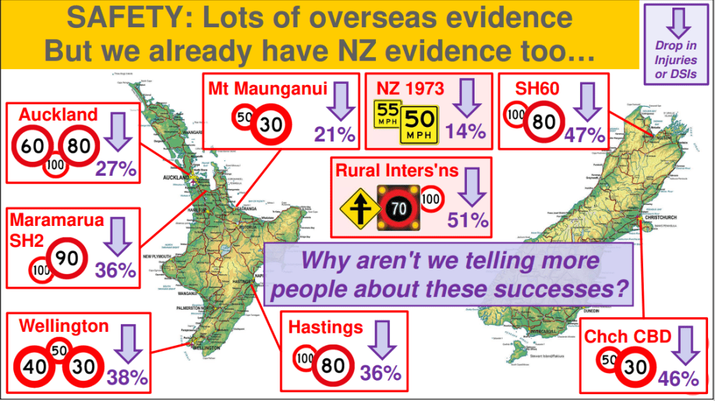 Lastly, if you’re in any doubt that our high speed limits do kill people, have a look at this great presentation from road safety expert Dr Glen Koorey. The summary slide below shows that when we reduce a speed limit, even when it’s by quite a small amount, we tend to see big reductions in deaths and serious injuries: