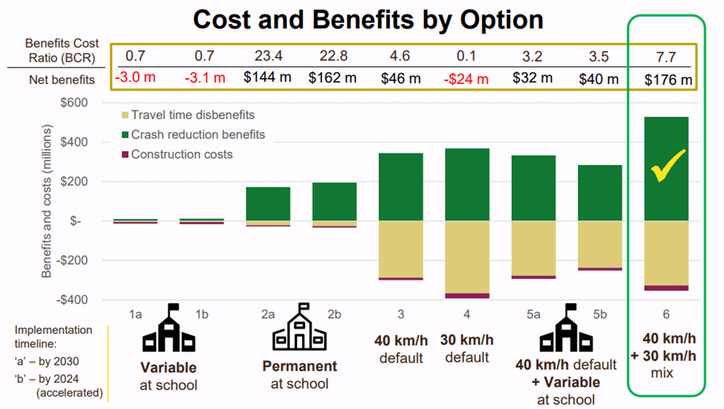 Last year, like most cities in NZ, Wellington initiated a piece of work to reduce speed limits around schools. Part of this involved commissioning a transport economist to complete a cost-benefit analysis of various options for reducing speed limits. This is documented in a council report from April 2023, and summarised in the graphic below: https://wellington.govt.nz/-/media/your-council/meetings/committees/kt-environment-and-infrastructure/2023-04-27-agenda-eic.pdf