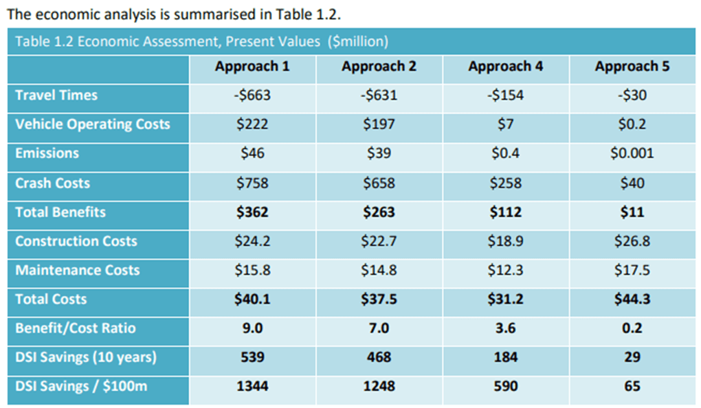 The green bars show that most options would result in a few hundred million dollars in crash reduction benefits. The tan bars show this is partially offset by travel time disbenefits, and some relatively small construction costs (basically just the cost of a whole bunch of signs and markings). For the preferred option the overall result was a Benefit-Cost-Ratio of 7.7. This means society gets back $7.70 benefits for every $1 it spends i.e. an extremely good investment.