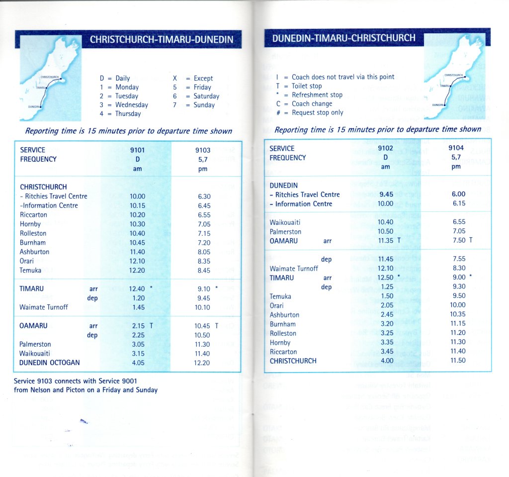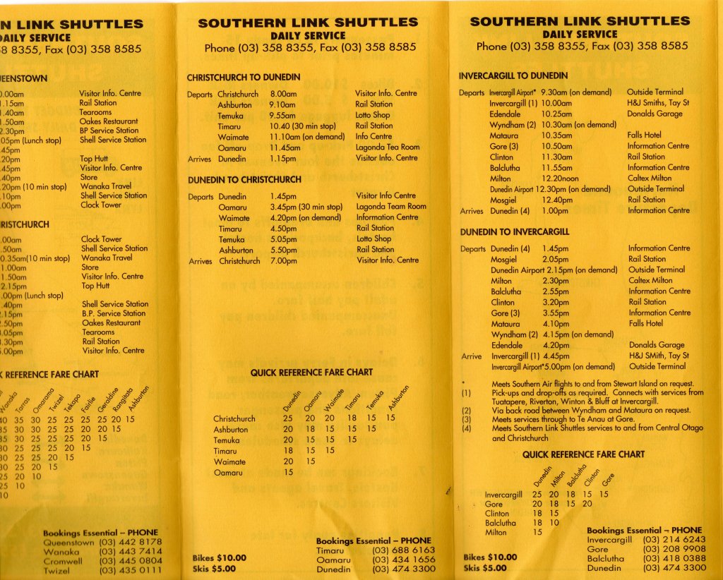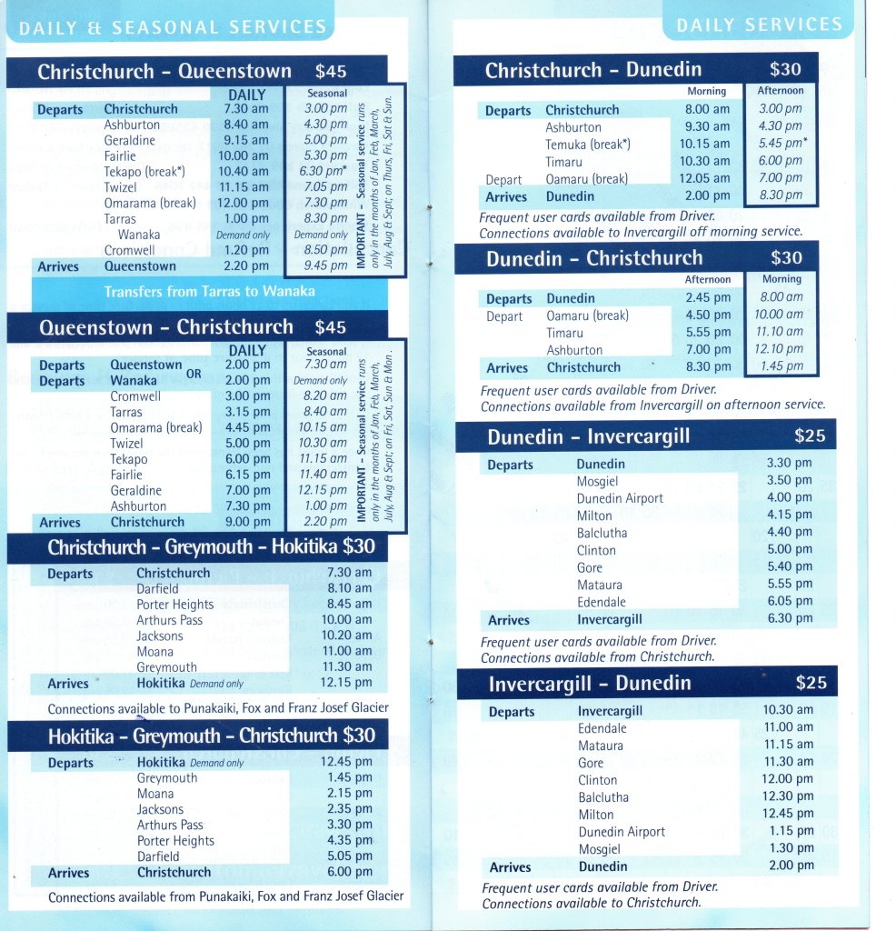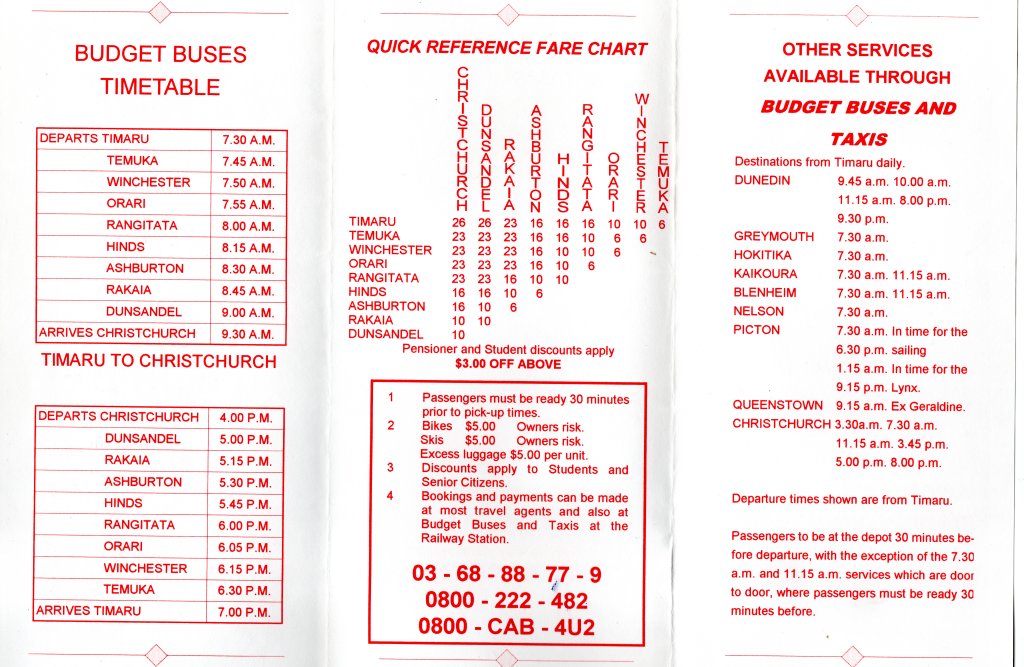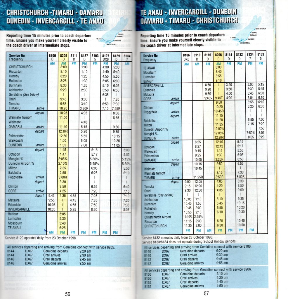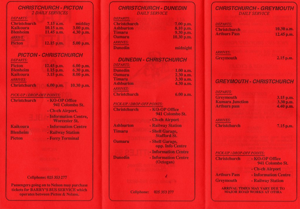 I recently sorted through some of my old documents and came across brochures for bus services on this route in the 1990s. While there was a bit of flux with several operator and timetable changes, there were far more options available. For example, Budget Bus lists 8 departures a day from Timaru to Christchurch. Only one of these services was provided by Budget Bus itself: that service left Timaru at 07.30 in the morning and departed Christchurch at 4.00 pm in the afternoon. The other services were provided by other companies, such as KO-OP Shuttles, which ran an overnight service to Dunedin. I’m not sure about the providers of all the services listed in the brochure.