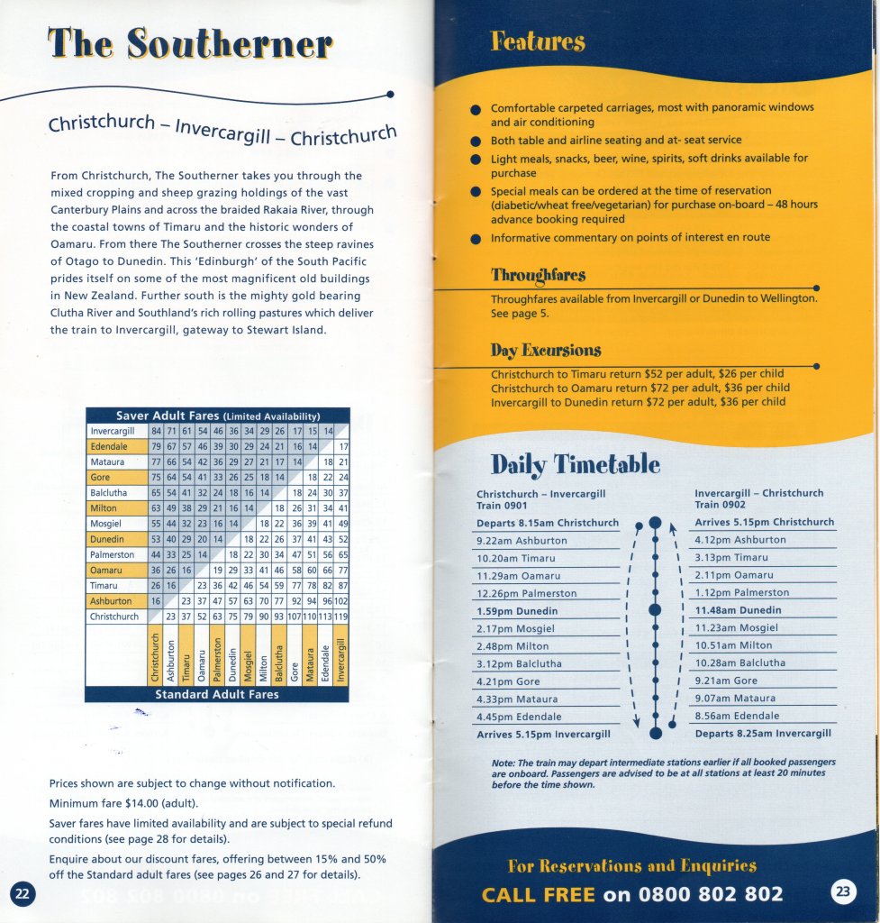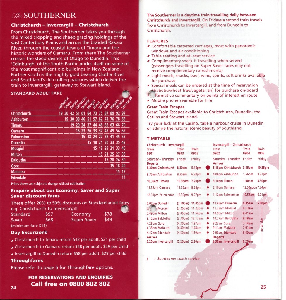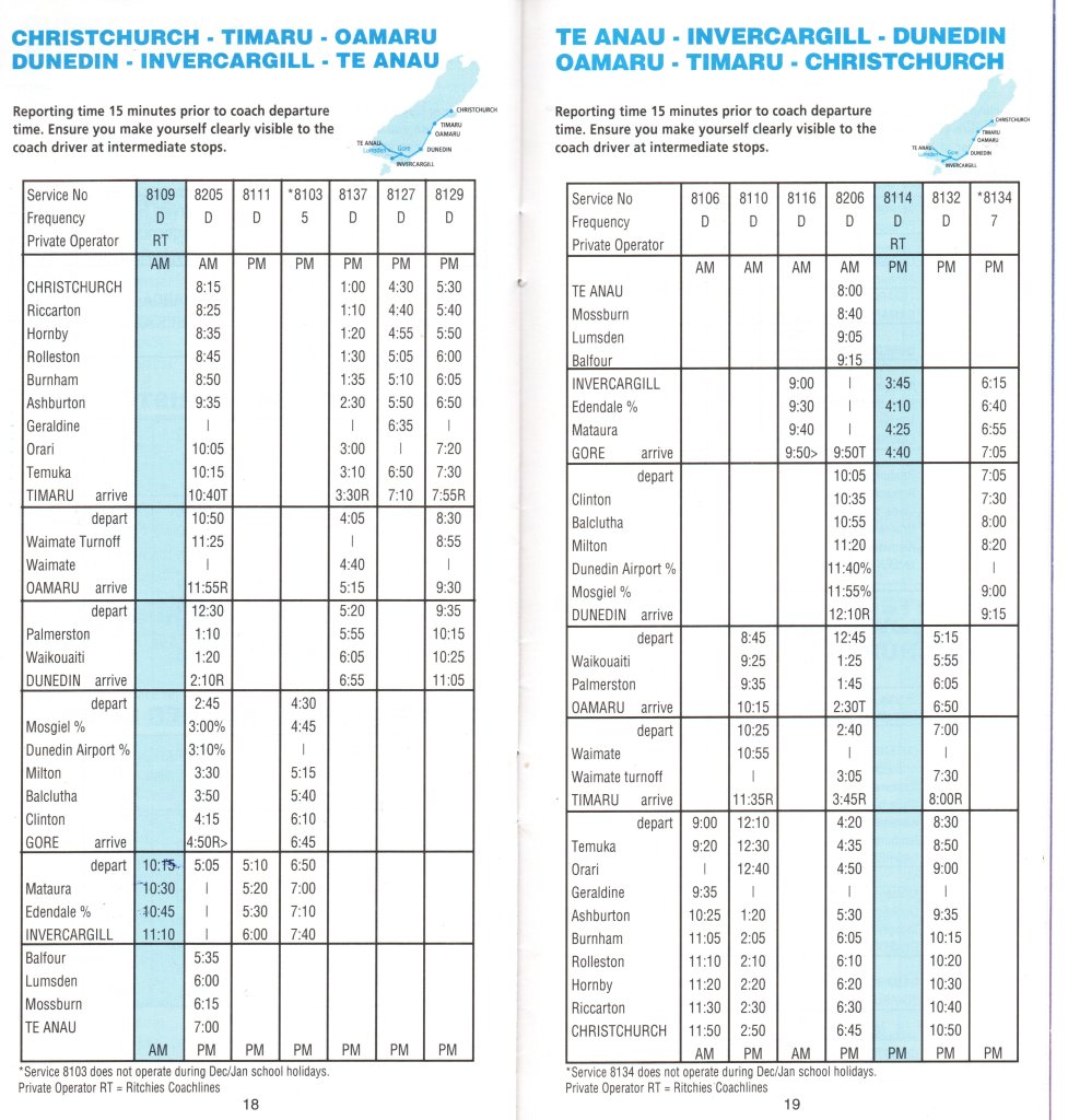 Many of the bus services competed with the Southerner train, which departed Christchurch at 08.15 am and returned through Timaru at 3.13 pm. The Southerner, InterCity, Atomic Shuttles, and Southern Link Shuttles therefore had similar departure times for the main service.