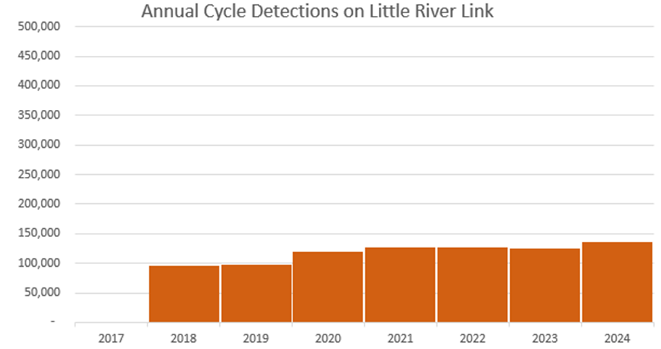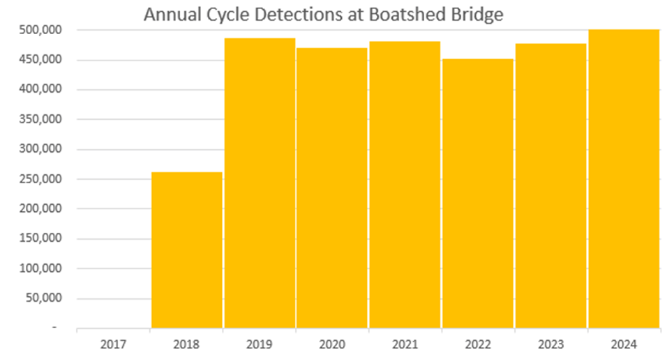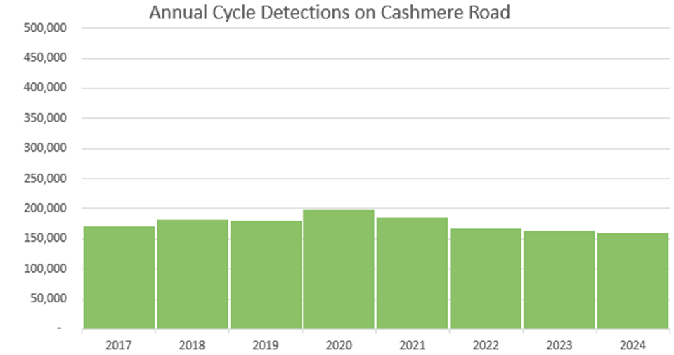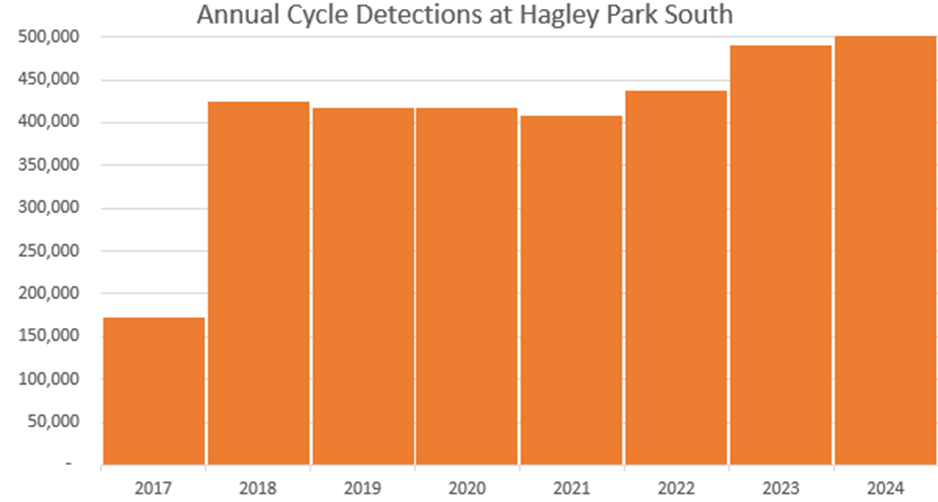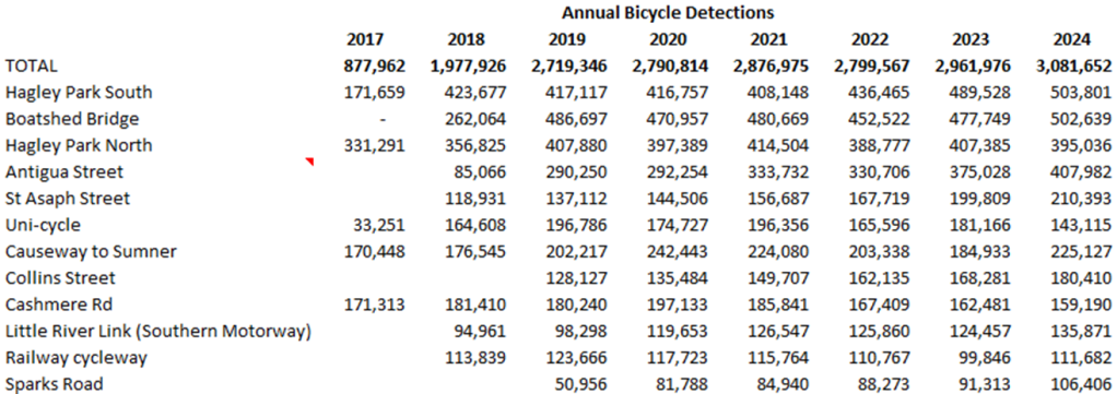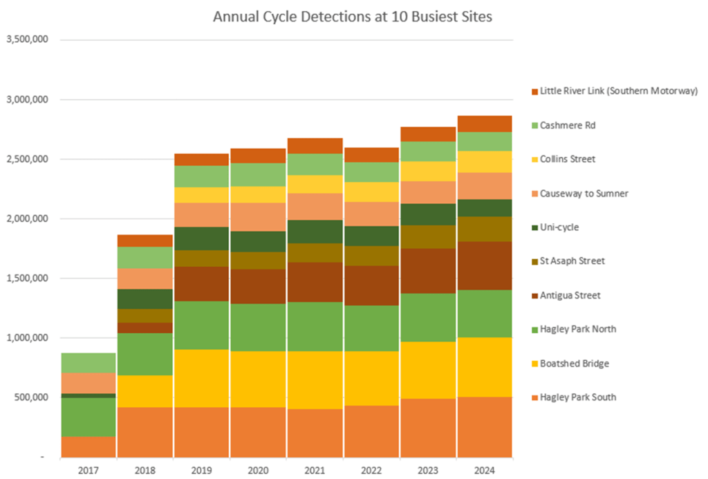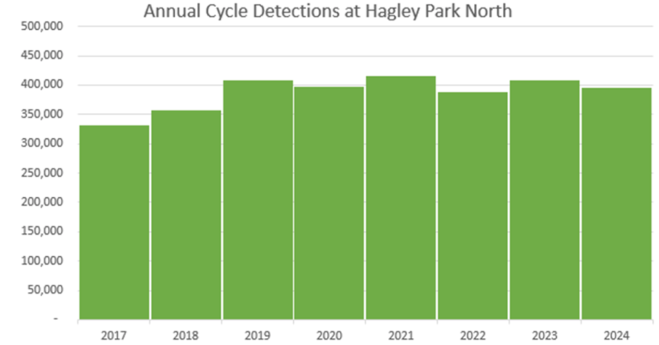 Rounding out the podium is Hagley Park North. Unlike Hagley Park South, it fluctuates a lot more, with a drop recorded in 2024 compared to 2023. One thing that may be influencing this one is that the location of the sensor is more prone to disruption, with the area often being fenced off when there are big events like Electric Avenue happening.