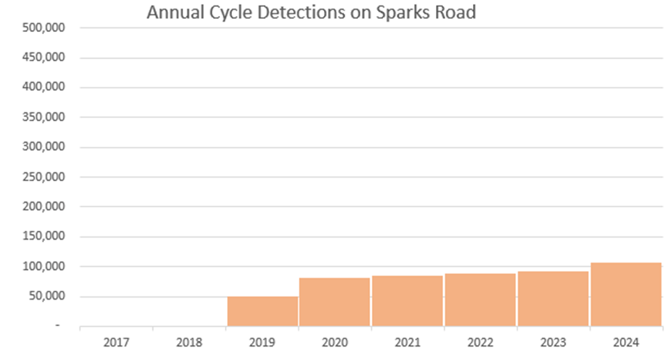 So that’s the top ten sites. To finish off, I thought I’d take a look at the Sparks Road counter as well. This one is dear to my heart as it’s the one I use on an almost daily basis, it’s close to my house, and it services my childrens’ primary school. From my own observation it seems to be utilised mostly by school kids and their parents. This counter has seen very high growth, with the total number of people riding past it being 17% higher than in 2024, and 108% higher than in 2019 when the cycleway first opened. On the ground that means that each day somewhere in the order of 70-80 more people are riding their bikes that were not in 2019. A lot of those will be children getting to and from school. In my humble opinion, that is a massive win for the kids, a massive win for their parents, and a massive win for the wider community. Certainly from a personal perspective it’s made a huge difference to the mental and physical health of my children and me.