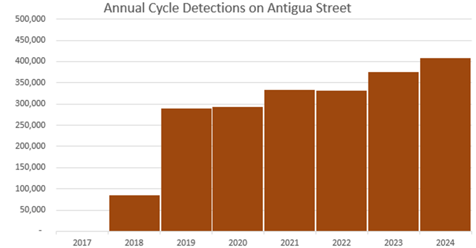 Antigua Street continues to grow strongly, with 100,000 odd more people biking down it in 2024 than did 5 years ago in 2019. This is very much the “network-effect” in action, with several other cycleways being built in that time further upstream and feeding into it.