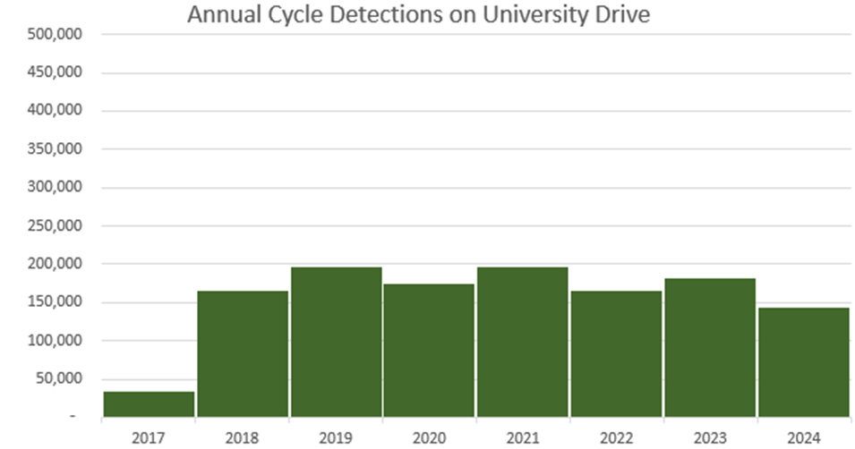 University Drive continues to perplex, fluctuating wildly over the last few years. Initially it was easy to brush off as covid-related, but 4 years on I’m not sure that’s still the case. There might be something else going on here, although I don’t know what. The sensor is in a slightly awkward spot between two intersections and a signalised crossing. Perhaps moving it to a mid-block location might get data more in line with what you’d expect to see?